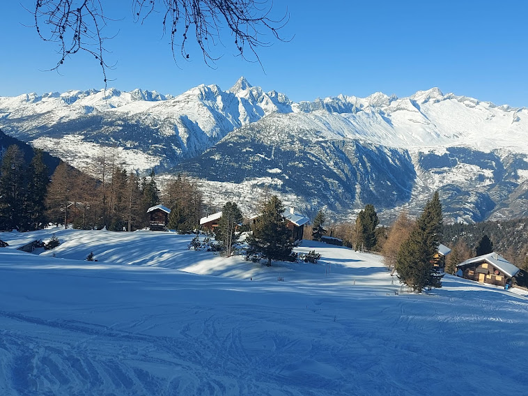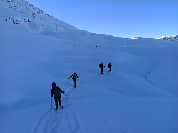 Quanti bei ricordi, ma abbiamo ancora la fortuna di trovarci in questo paradiso, con un panorama incredibile dai Quattromila del Sempione all’Oberland Bernese. Durante la discesa ci godiamo le ciaspole sulle linee di massima pendenza della ripida pista, battuta solo dagli sciatori.