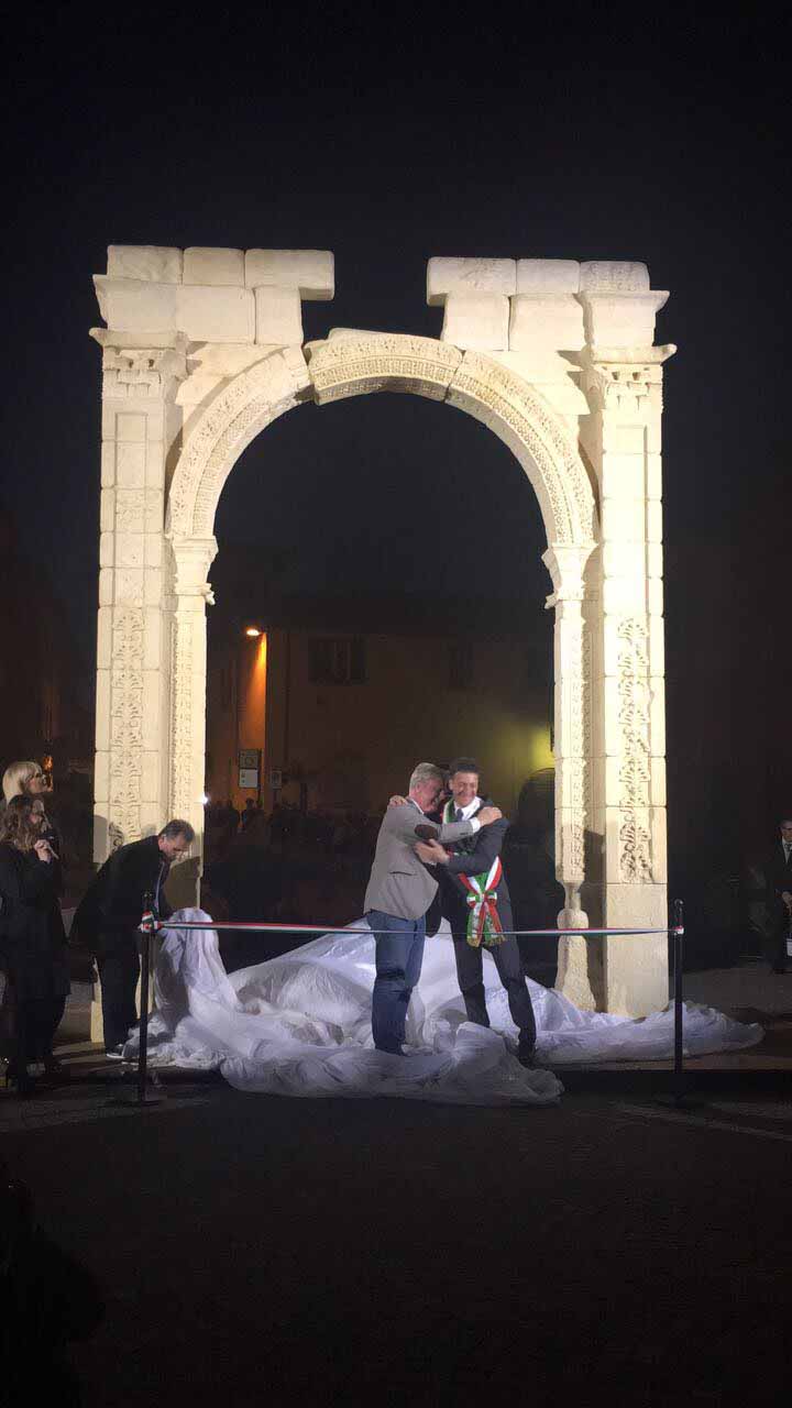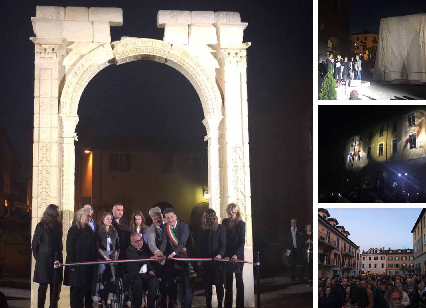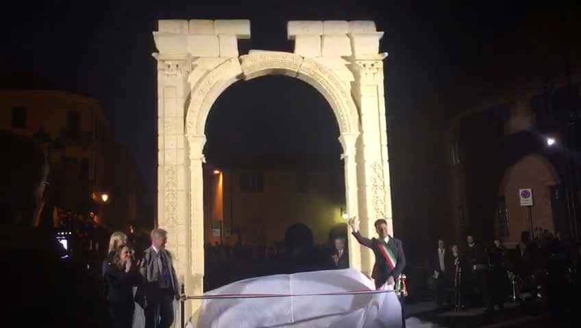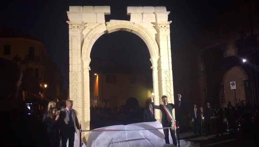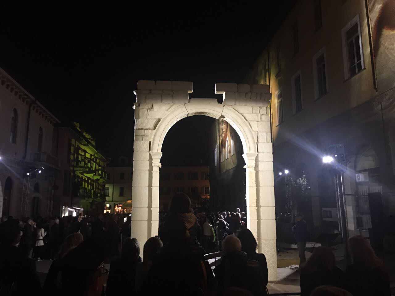 ARONA- 30-04-2017- Tanta emozione, e qualche lacrima di commozione in ricordo del sacrificio di Khaled al-Asaad, l'archeologo trucidato dall'Isis perchè rimasto per preservare il sito di Palmira, ad Arona sabato sera per l'applauditissima inaugurazione della ricostruzione tridimensionale dell'Arco di Palmira, che approda sul lago Maggiore dopo le prestigiose vetrine di New York, Londra, Dubai e Firenze, dove resterà per tre mesi. Sino alla fine di luglio ogni sera ci sarà uno spettacolo di luci e suoni: “E' un'iniziativa che nasce dell'intitolazione del nostro museo cittadino a Khaled al-Asaad- spiega il sindaco di Arona Alberto Gusmeroli- è stato un archeologo incredibile, ha dedicato la vita per preservare Palmira, rimanendo in città con l'invasione dell'Isis, rimanendo trucidato. Sono mesi che lavoriamo per questo momento importante, non solo per noi di Arona, ma per tutto il territorio. Vediamo come la civiltà, una cultura millenaria è più forte della barbarie. Avremo tutte le sere uno spettacolo musicale e di luci che abbraccerà la piazza e l'arco, avremo incontri e momenti di riflessioni, l'apertura del museo e la chiave di volta di Palmira. Tanti motivi per avvicinarsi ad un mondo importantissimo come quello della nostra storia, ma anche ad Arona ed al nostro museo. Un gemellaggio fra Arona e Palmira su cui abbiamo creduto guardando anche al futuro degli studi archelogici di Arona, oggi abbiamo annunciato che Politecnico di Milano ed Università Cattolica faranno con noi un progetto, mandando gli studenti a studiare la parte più alta della Rocca per fare sondaggi ed una campagna di scavi”.