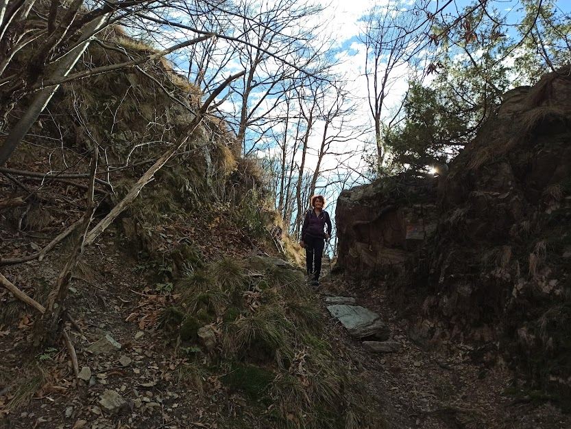 Saliamo in presa diretta lungo i terrazzamenti, di cui la zona è ricchissima, per un centinaio di metri. Un tratto pianeggiante verso sinistra (occidente) ci riporta sul sentiero più noto verso Monteossolano, che parte dalla piazzetta di Cisore. Seguendo il sentiero, incrociamo più avanti il bivio con il sentiero Arlo, contraddistinto da segni a forma di fiore a 4 petali azzurri. Si tratta di una variante “alta” che porta comunque a Pregliasca, allunga un po’ il percorso, ma permette di evitare un breve tratto esposto, con ringhiere, che attraversa la valletta del Rio Gaggio.