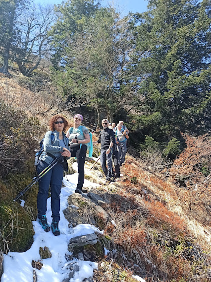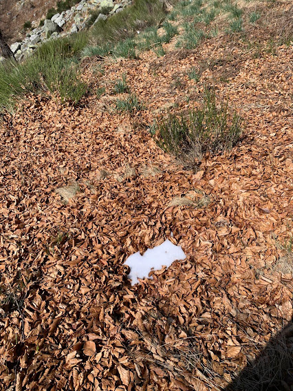 Ieri una telefonata quasi allarmata di un ex alpinista acciaccato, oggi presente, mi aveva preannunciato montagne di neve su ripidi pendii sia a sud che a nord della vetta. E dire che dal basso si vedeva un paesaggio estivo. In effetti saliamo nel ripido bosco, ginocchia in bocca, incontrando, quasi in vetta, nevai da dieci centimetri per dieci, spessi qualche millimetro. Potete immaginare la sfilza di battute molto ironiche che richiamano chiodi da ghiaccio, piccozze con due c (vedi Zingarelli) e ramponi a dodici punte.
