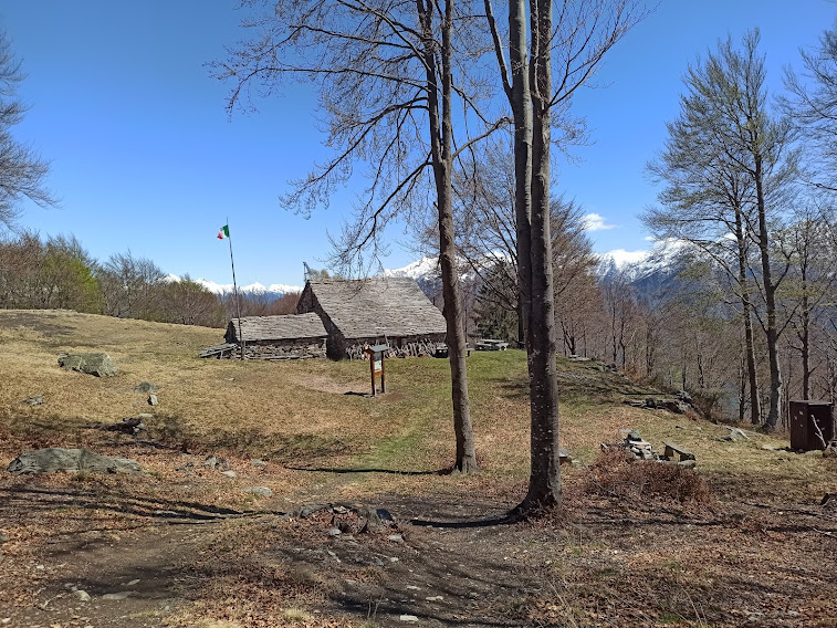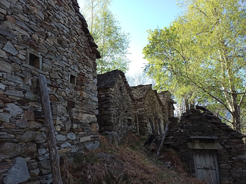 In questo tratto, esposto a nord ovest, troviamo effettivamente qualche centimetro di neve che serve soltanto ad alzare il livello delle nostre burle infantili. Sui due comodi tavoli esterni di sasso ripristiniamo le energie al caldo sole di fine aprile. Puntiamo poi su Villadossola, passando dall’Alpe Baldana, 1215, dall’Alpe Vancone, 988, incrociando la strada asfaltata e raggiungendo l’Alpe Corticcio, 784. Fino a qui il sentiero evidente è anche pulito.