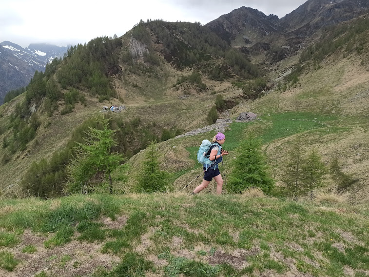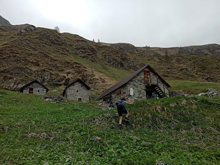 Più in alto ecco l’Alpe Agrosa, 1726, dopo due ore e un quarto di cammino effettivo. Il tempo incerto abbrevia la nostra sosta. Ci sono cartelli indicatori gialli e rossi inutilizzabili, ma il sentiero D20, che ora punta a nord, è abbastanza evidente. In poco più di mezz’ora, dopo una breve discesa per attraversare un torrentello che confluisce nel Rio Straciugo, saliamo a Campo, 1895, e qui pranziamo. Sulla cartina questo è Campo, mentre l’Alpe Campo è indicata a quota 2200, in prossimità dei laghetti omonimi.
