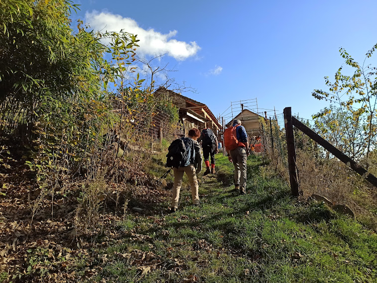 Parcheggiamo all’ingresso del paese, quota 729, e passiamo vicino al piccolo cimitero per andare a imboccare il sentiero R09 che entra subito nel bosco. Per tutta l’escursione cammineremo con attenzione, su terreno scivoloso e ricoperto di foglie, a volte impervio ed esposto. Ce la prendiamo inizialmente con calma, con pause di vario genere.