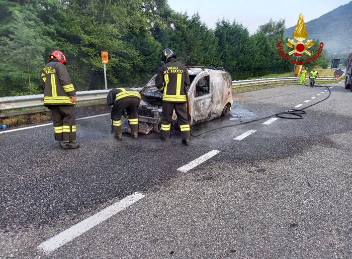 BROVELLO C. - 28-06-2023 -- L’autista s’è accorto che qualcosa non andava, ha accostato e, insieme al passeggero, è sceso dell’abitacolo guardando il mezzo che andava in fiamme. Non ci sono feriti nell’incendio che s’è verificato alle 20 di oggi sull’A26, in direzione nord. In un tratto dell’Autolaghi a ridosso dello svincolo di Brovello Carpugnino, un furgone è stato completamente distrutto. A domare l’incendio sono stati i vigili del fuoco del comando provinciale di Verbania, coadiuvati dai colleghi di Arona. Sul posto anche la Polstrada.