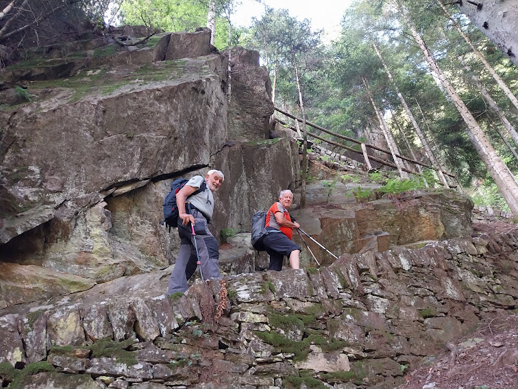 Il gruppo A, composto da quelli più in forma, si avvia verso la Val Tignaga e salirà al Passo dall’Alpe Piana di Ceppo Morelli, dalla Cappella del Cour Gil e dagli alpi Corte Sotto e Cascina Nuova. Il gruppo B, di cui faccio parte, composto anche dall’ex alpinista acciaccato e da due illustri soci (presidente e medico) al rientro dopo un periodo difficile, si avvia lungo il sentiero B 23 verso l’Alpe Laveggio.