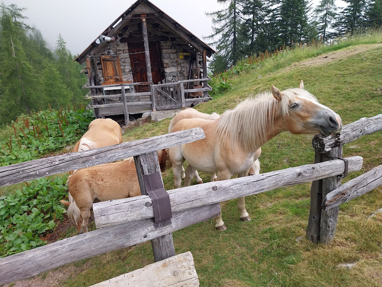 Qui i padroni incontrastati sono quattro socievoli cavalli. La nostra meta sarebbe raggiunta, ma è ancora presto, stiamo bene e del gruppo A, impegnato in un’escursione ben più lunga, non c’è ancora traccia. Decidiamo quindi di alleggerire gli zaini e, con il beneplacito dei cavalli, di andare loro incontro. Di qui in su il sentiero è un po’ più impegnativo, ma ben tenuto, evidente, senza alcun problema.
