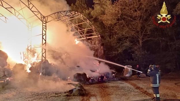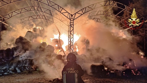 CASTELLETTO TICINO - 31-08-2023 -- Vasto incendio nella tarda serta di mercoledì 30 agosto a Castelletto Ticino. Sul posto i vigili del fuoco di Arona. Ad andare in fiamme un cumulo di rotoballe di fieno e paglia. I vigili del fuoco hanno attaccato l'incendio, salvaguardando le abitazioni adiacenti e le circostanti aree boschive. Presenti in loco anche altre squadre dei vigili del fuoco di Novara e dai distaccamenti volontari di Oleggio e Romagnano Sesia con diverse autobotti e volontari Aib. Presenti anche i Carabinieri di Borgo Ticino. Nel tardo pomeriggio di giovedì 31 agosto l'intervento non era ancora concluso.