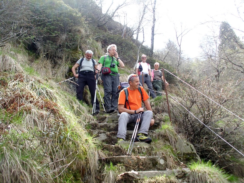 Ancora tre quarti d'ora, aiutati anche da qualche catena, utile ma non indispensabile, e siamo in vetta, 1715. C'è ancora qualche piccola chiazza di neve sul versante occidentale, verso la Valle Cannobina. La dura salita ha fatto una certa selezione, ma ci ricompattiamo rapidamente. Qualche foto di gruppo e alla parte di panorama che le nuvole vaganti ci concedono ed inizia la discesa in direzione sud, su traccia, sentiero e strada sterrata nell'ultimo tratto. Siamo sul versante occidentale della lunga dorsale che dal Monte Giove sale verso nord, al Faierone ed al Limidario.