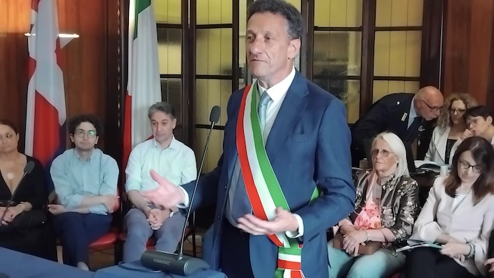ARONA - 25-06-2024 -- Consiglio comunale d'insediamento della nuova amministrazione Gusmeroli, con giuramento del sindaco, nella serata di lunedì 25 giugno al Teatro San Carlo di Arona. La sala era abbastanza gremita nonostante la concomitanza con la gara della Nazionale italiana agli Europei di calcio.