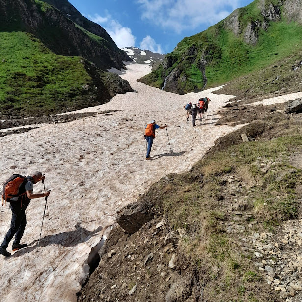Unico problema il recupero auto, ma uno del gruppo ha l’auto laggiù che ci aspetta. La proposta “passa” con maggioranza bulgara. Lasciamo il sentiero G95 e ci abbassiamo di un centinaio di metri in Val Vannino, tenendo la sinistra. Ci fermiamo per il pranzo in un pianoro dove avevamo già sostato durante le escursioni precedenti percorse in senso contrario. Qui diventa indispensabile la conoscenza del territorio, garantita dalla nostra guida di oggi, che seguiamo sempre con cieca fiducia. Dopo la pausa iniziamo una traversata in quota, diretti a oriente, su terreno facile ma senza sentiero, solo rari ometti e con saliscendi che incrementano il dislivello.