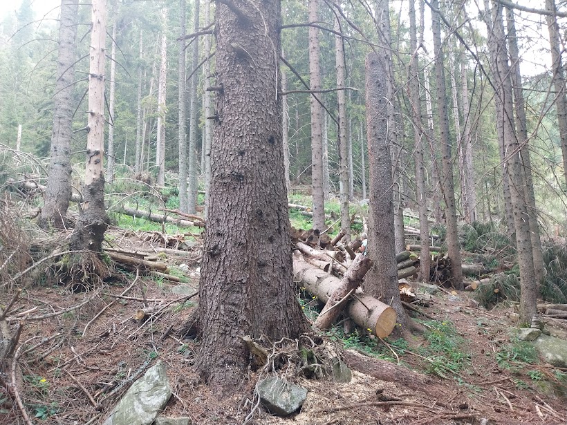Rododendri, mirtilli, larici prendono il posto degli abeti e delle vaste praterie del versante sud. Raggiungiamo in pochi minuti l’Alpe Curtvel (Curtvello), 1756, con la sua bella fontana di legno e pranziamo vicino all’altrettanto bella baita. Ci manca molto oggi il buon caffè della badante esperta, presa da impegni di mamma. Riprendiamo la discesa nel bellissimo bosco di larici e su un lungo traverso verso oriente con scorci stupendi sul Pizzo Andolla e sul bacino dell'Alpe dei Cavalli, Cheggio per gli amici.