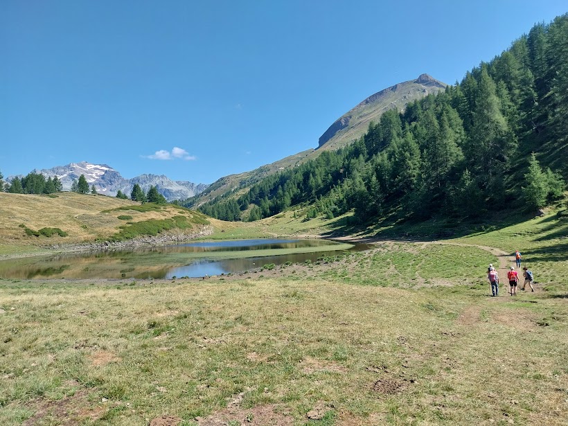 Un breve e ripido strappo ci porta a scollinare sul territorio di Devero, accolti da Cervandone, Rossa e Grampielhorn in formato “regale”. Dopo una veloce colazione proseguiamo verso nord in queste meravigliose radure pianeggianti, lungo una trattorabile che passa, più alta, in corrispondenza dell’Alpe Fontane e ci porta al più meridionale dei laghetti del Sangiatto, 2034. Sulla nostra destra ci dominano Corona Troggi e Monte Sangiatto.
