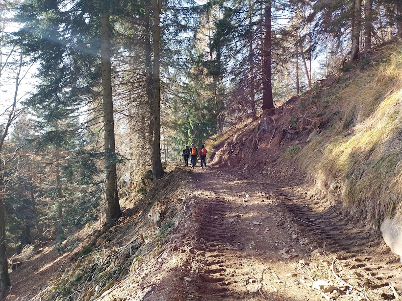 Non ci stupiremmo: sappiamo che la brama di piste agro-silvo-pastorali nell’homo sapiens è quasi pari a quella di centraline idroelettriche. Poco sopra quota 1200 incontriamo un’altra pista pianeggiante sulla destra, che sembra recente, vista la consueta devastazione. La imbocchiamo in direzione ovest che più avanti diventerà sud.