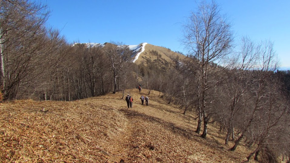 Splendida giornata, il vento è rimasto in Ossola. Tredici ragazzi, di età media sui 65 anni, due gentili signore ben più giovani e Nena, una signorina Labrador, s'incontrano di primissimo mattino a Cossogno. Subito dopo il ponte ad ingresso paese s'imbocca una stradina sulla destra e si posteggia in prossimità dell'inizio del sentiero del chilometro verticale, quota 400. Chi volesse ridurre il dislivello può, forse, salire in auto fino alla località Cresta.