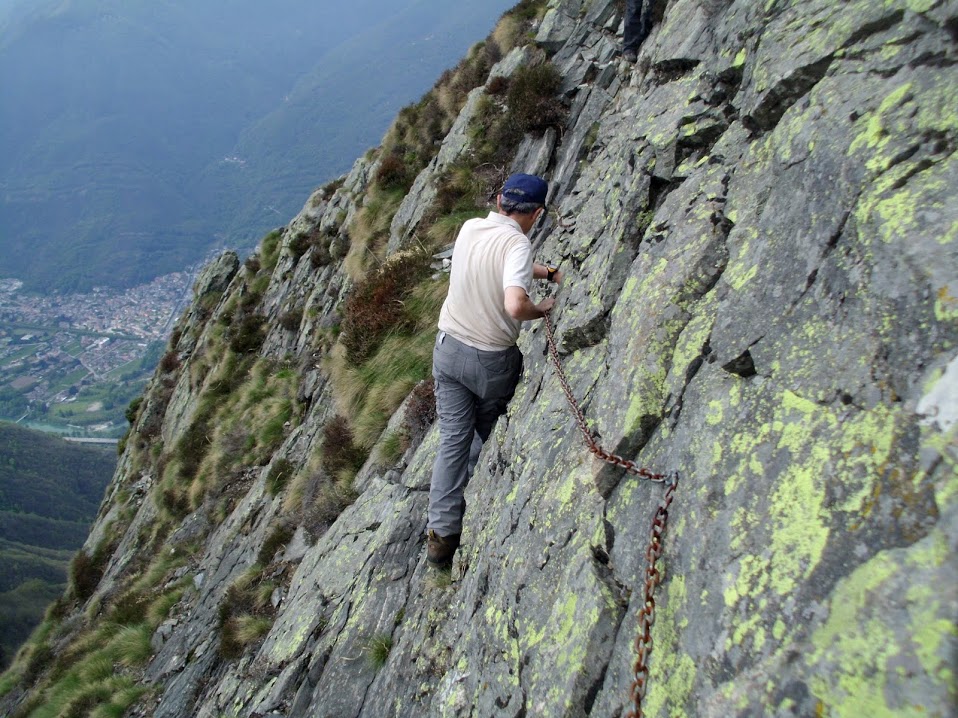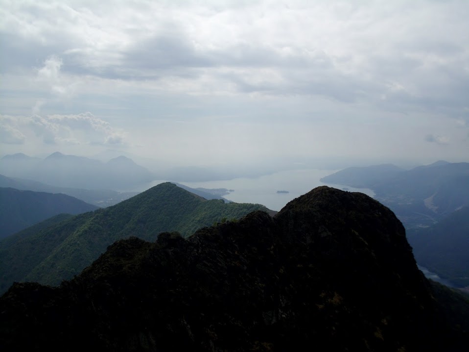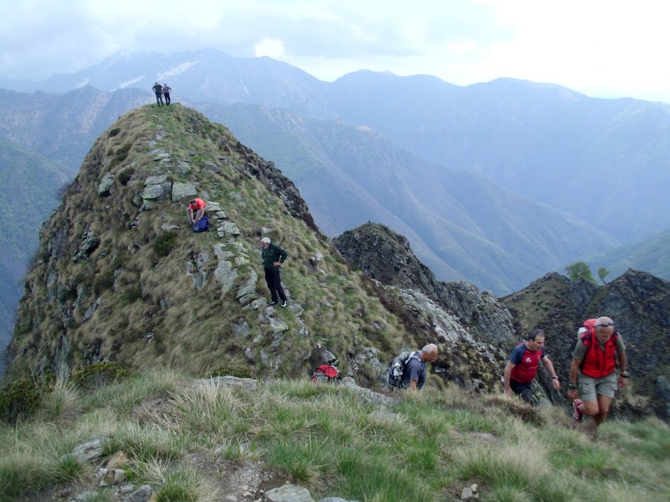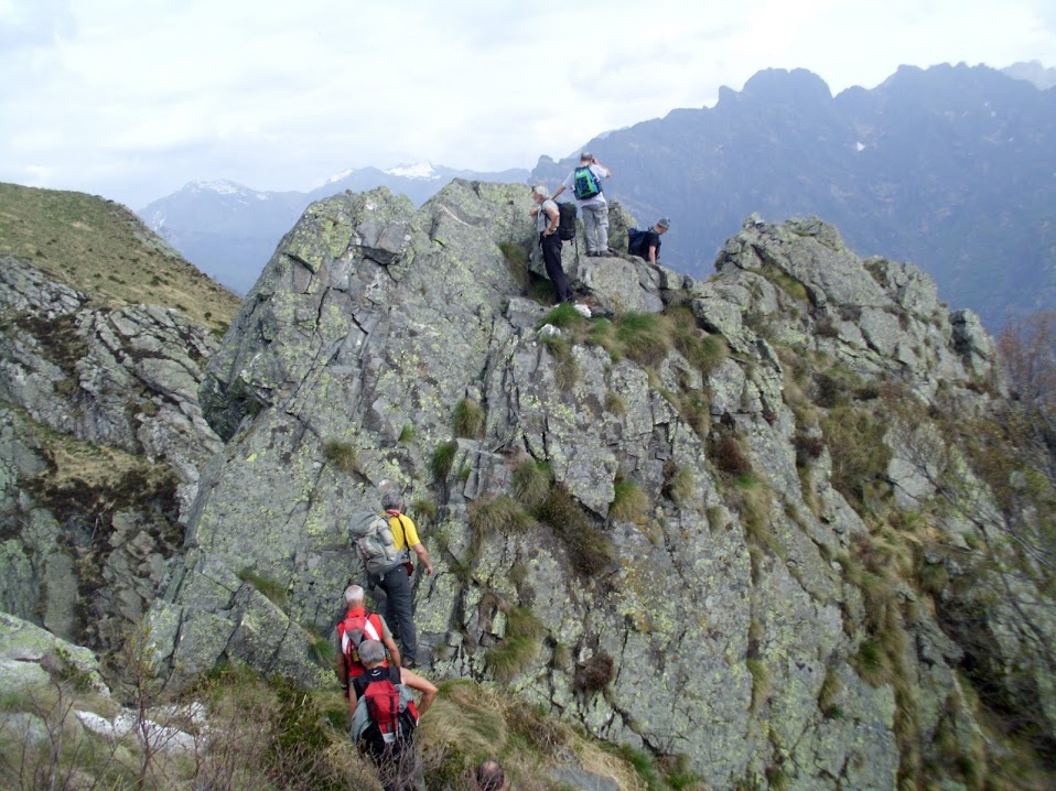Alcuni escursionisti,  nonostante la disapprovazione sacrosanta delle guide, abbandonano gli zaini lungo il percorso per ridurre la fatica. Penultima ripida salita sul pratone detto Pasquetta e qui lasciamo le racchette che ci intralcerebbero. Ripidissima discesa su sentiero un po' esposto, traverso attrezzato e ultima salita, sempre attrezzata. Siamo in vetta, 1574, dopo un’ora e tre quarti dalla Colma di Vercio. Pietose borracce di chi ha ancora lo zaino soccorrono chi ha le spalle colpevolmente scariche, ma che sia l'ultima volta! Panorama stupendo su laghi, Ossola, Val Grande ed altro.