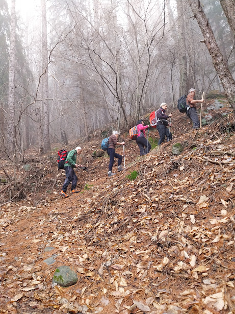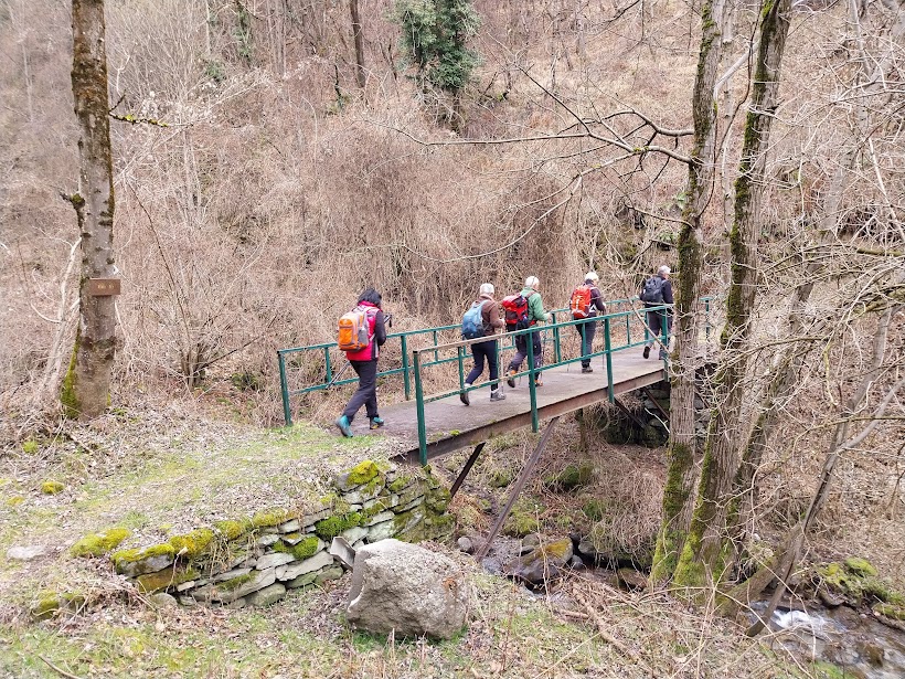 La giornata nebbiosa ci concederà anche due gocce di pioggia, due di numero, e rarissimi sprazzi di sole, ma panorama zero. Ci concentreremo meglio sulle tante cose belle e ben visibili che incontreremo. L’occhio clinico del medico esperto nota subito il mio colorito grigiastro e adegua fin da subito il passo del gruppo alle condizioni del suo anziano grafomane. La prima cosa che notiamo subito qui a Varzo, sia nei parchi di vecchie ville sia nei boschi, è la presenza di alberi “monumentali”, che meriterebbero un libro. Dal centro di Varzo, quota 560, saliamo ad imboccare il Sentiero delle Volpi che, in direzione nord ovest, ci porta rapidamente a Raguzzo, 690. Proseguiamo attraversando il grande prato e seguiamo una pista sterrata. Alla nostra sinistra la forra del Torrente Cairasca.