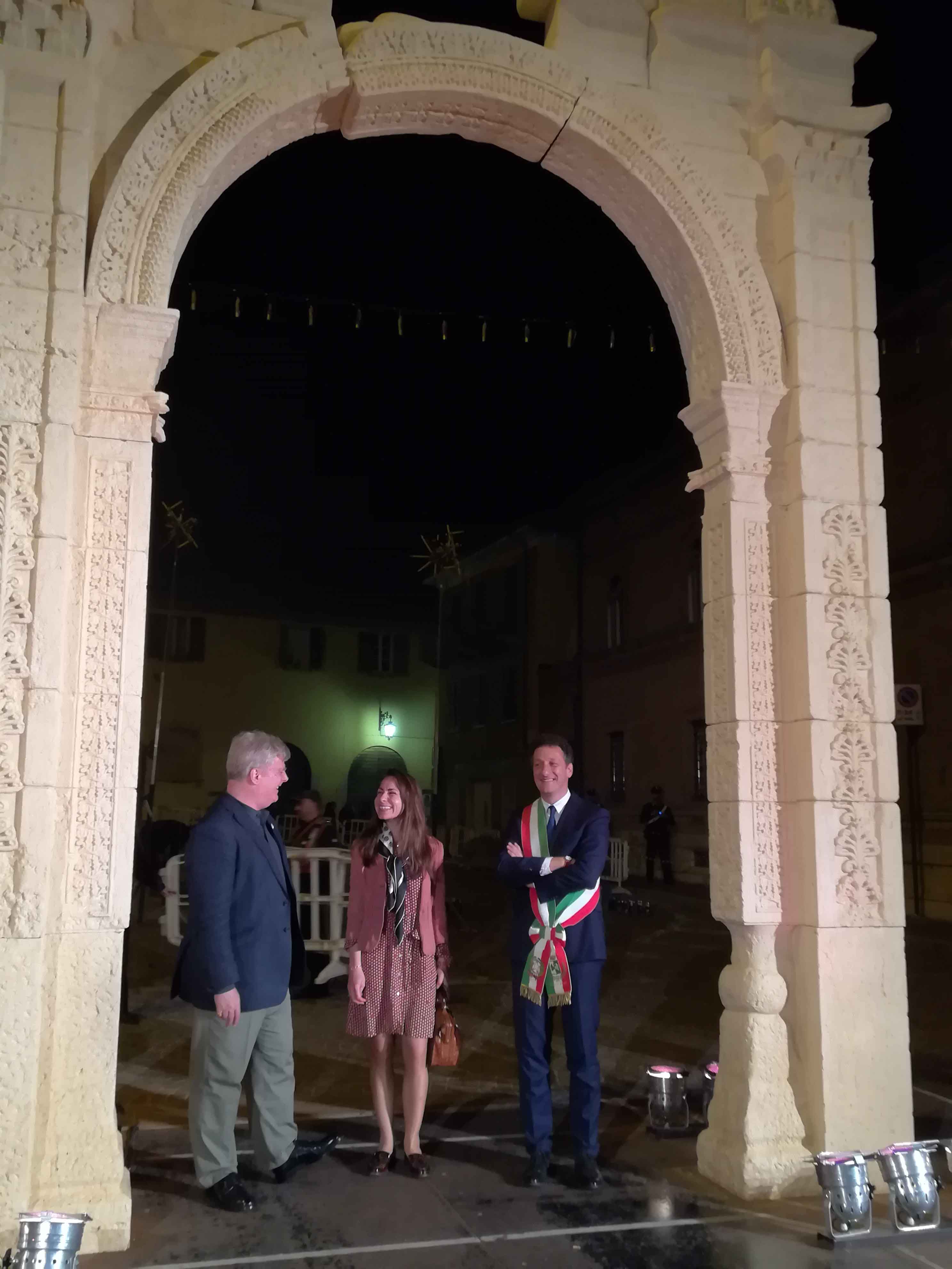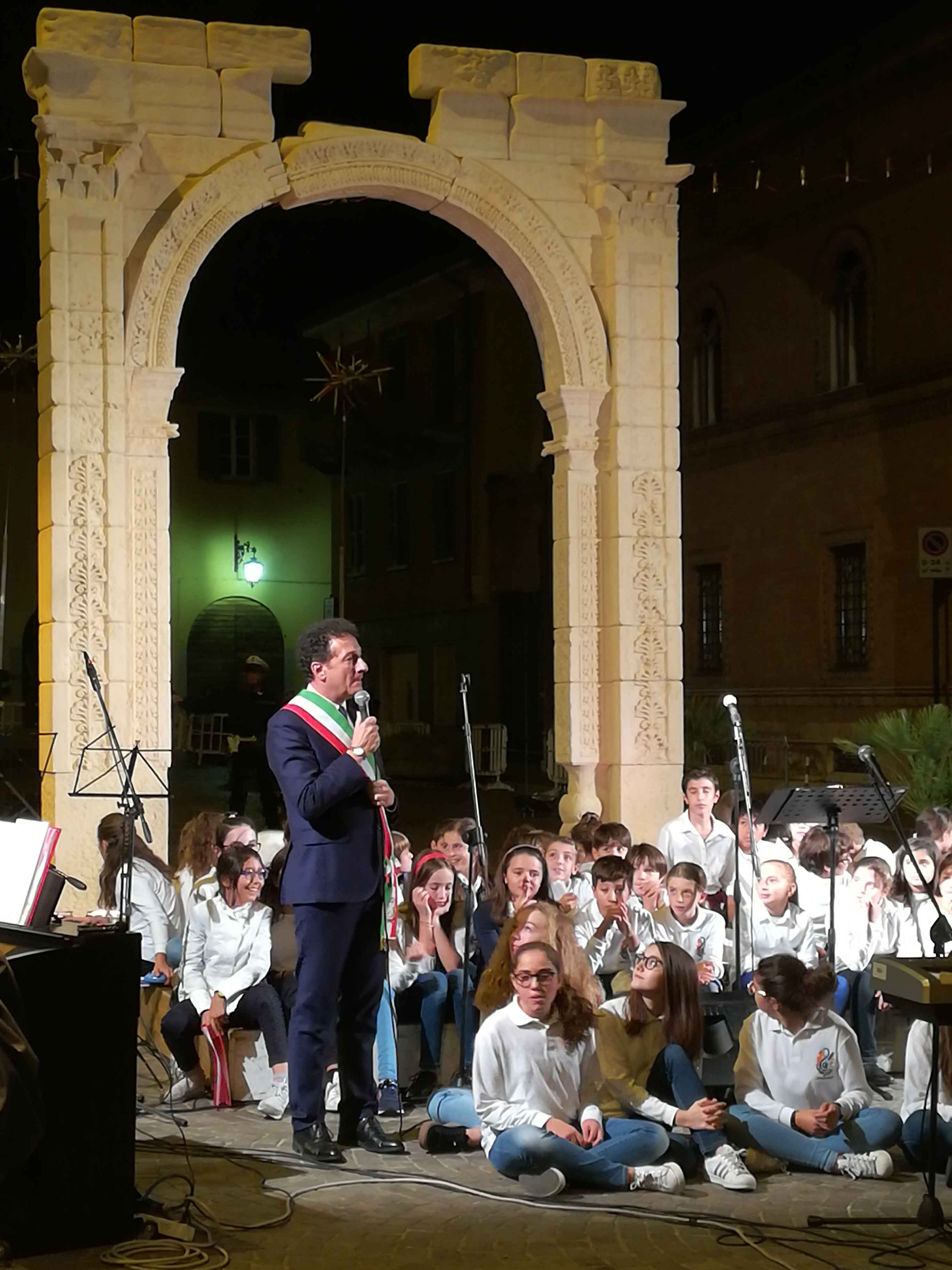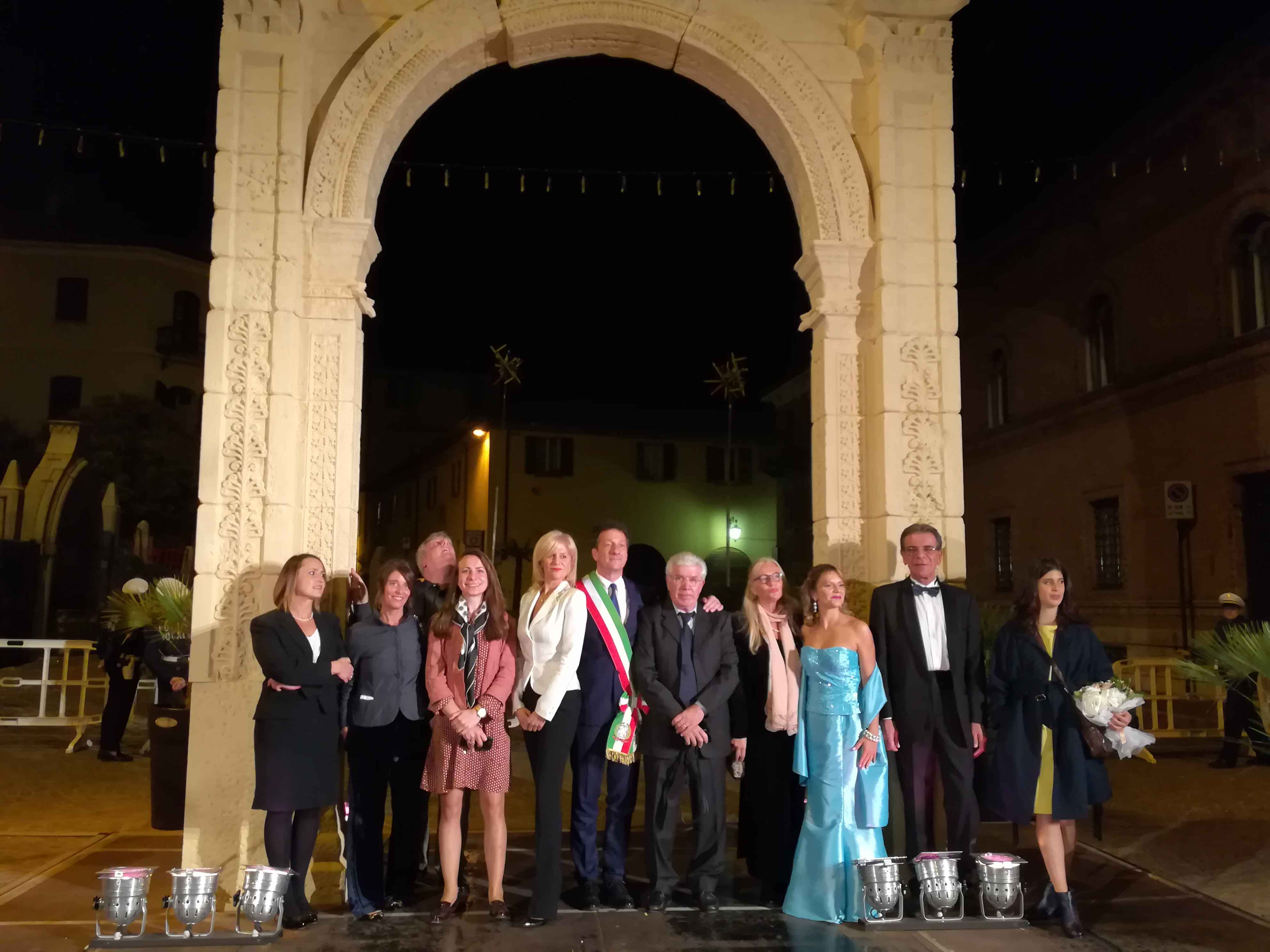 cerimonia per salutare l'Arco di Palmira in partenza per Parigi. Venerdì 29 settembre, in numerosi si sono ritrovati in Piazza San Graziano per dare l'ultimo saluto alla riproduzione dell'Arco divenuto simbolo di pace e umanità e che nei suoi cinque mesi di permanenza in città ha visto sfilare migliaia di persone e scolaresche provenienti da tutta Italia e non solo, a testimonianza di “come nella vita sia importante riuscire a lasciarsi alle spalle le negatività, ricordandosi quotidianamente quanto la vita sia bella e come vada vissuta appieno e sempre nel rispetto delle persone”. Era stato proprio questo l'invito che il sindaco Alberto Gusmeroli aveva rivolto alla comunità durante la cerimonia d’inaugurazione, svoltasi lo scorso 29 aprile; in molti hanno dato dimostrazione in questi mesi di averlo interiorizzato e nel discorso di commiato, Gusmeroli ha ricordato tra tutti i visitatori della riproduzione Waled e Omar al Asaad, figli di Khaled al Asaad (l’archeologo custode del sito di Palmira, brutalmente ucciso dall’Isis nel 2015, ndr): “Un uomo ucciso nel corpo ma non nelle idee, nelle speranze e nell’esempio”. Roger Michael e Alexei Karenoska dell’Ida, Institute for digital archaeology, si sono complimentati con l'Amministrazione e con tutti i cittadini che hanno dato segno di aver colto sino in fondo il vero significato dell'installazione: “Quando è partita l'idea di riprodurre l'arco di Palmira, non tutti erano favorevoli - ha ricordato Micheal - Io credo che se quelle persone fossero state qui ad Arona il 29 aprile scorso e avessero visto tutta la gente che con gioia ha attraversato l'Arco, ebbene quella sarebbe stata la miglior dimostrazione di come il suo significato sia stato compreso e condiviso. Ovunque l'Arco sia stato esposto, Londra, Dubai, New York, Firenze le persone hanno avuto modo di capire cosa significa la fratellanza e chiunque l’ha visitato è diventato parte di una tradizione, portatore di speranza e pace. Ecco la magia dell’Arco risiede proprio nella sua capacità di far nascere relazioni e ad Arona sono state le migliori mai instaurate”. Hanno sottolineato queste parole le voci di Matilde Mirotti che ha introdotto la serata con la sua Damasco e la soprano Gabriella Selvaggio dirette dal Maestro Paolo Beretta. La cerimonia, condotta da Simona Arrigoni, è stata aperta dalla Nuova Filarmonica Aronese che ha eseguito gli inni per poi lasciare spazio alle voci dei 120 ragazzi del coro dell’ IC Giovanni XXIII accompagnati dai prof. Antonio Dellacà e Marta Valerio, diretti dal Maestro Marino Mora. Prima dei saluti, la consegna di un’opera unica realizzata dall’artista aronese Nicola Malcangio che ricorderà per sempre all’ Ida la florida e sincera collaborazione con l’Amministrazione comunale in occasione di questo straordinario evento straordinario che ha regalato città una visione internazionale di tutto riguardo. La serata si è conclusa con uno spettacolo pirotecnico musicale che, sulle note della Carmina Burana, ha salutato l'Arco ripercorrendone in modo unico e altamente suggestivo la storia: dai fuochi rossi della distruzione al bianco della rinascita nel gran finale.