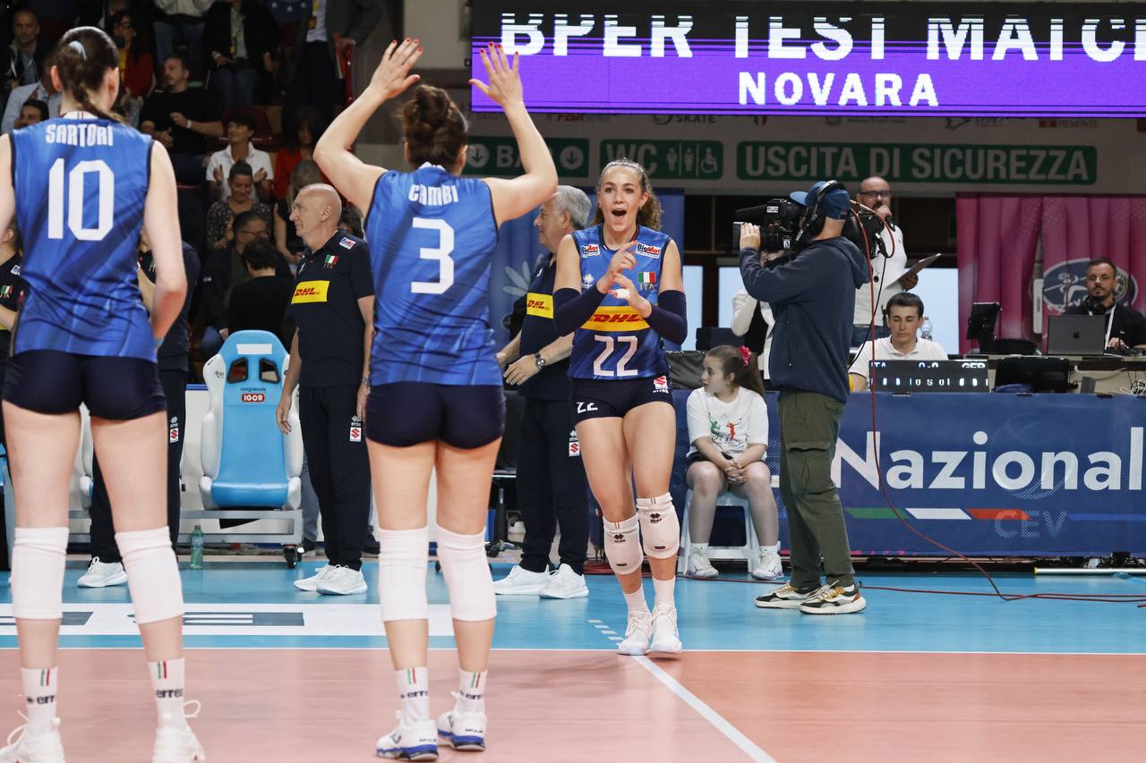 NOVARA - 09-05-2025 --Festa azzurra a Novara, all'esordio stagionale la nazionale femminile di Julio Velasco, impegnata al Pala Igor di Novara nel primo dei due BPER Test Match, ha battuto la Germania 3-1 (25-18, 20-25, 25-17, 25-21). Dopo quasi due ore di gioco Carlotta Cambi e compagne si sono imposte sulla nazionale tedesca allenata dal tecnico italiano Giulio Bregoli. Vittoria meritata per le azzurre, spinte anche dal calore del pubblico che ha potuto così riabbracciare la nazionale azzurra nella prima uscita ufficiale dopo la straordinaria medaglia olimpica ottenuta ai Giochi Olimpici di Parigi 2024. Molto buona la risposta dei tifosi: 2470 gli spettatori presenti al Pala Igor, per un totale di 32.980,00 euro d’incasso.
