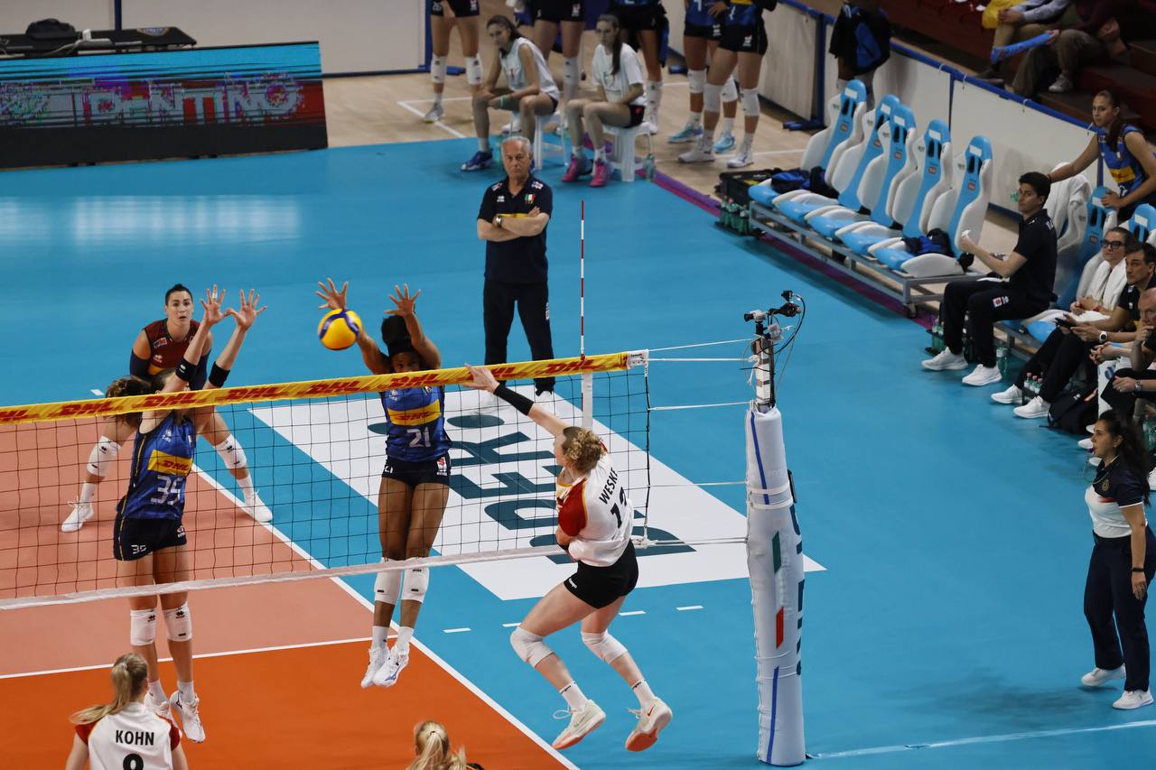 LA CRONACA - Per questa prima uscita stagionale contro la Germania Julio Velasco si affida al sestetto composto dalla diagonale Cambi-Malual, Sartori e Munarini centrali, Giovannini e Omoruyi schiacciatrici e Moro libero. L’Italia parte con il piglio giusto, Giovannini e Sartori per il 2-0 iniziale; muro a due azzurro di Giovannini e Munarini, un ace della stessa schiacciatrice azzurra e l’Italia si porta sul 6-2. Al rientro in campo le tedesche si avvicinano: attacco di Weitzel e la Germania si porta a -2 sul 9-7. Pronto riscatto azzurro: bene al servizio Giovannini, muro di Munarini e attacco vincente di Malual con l’Italia che scappa a +5 sul 15-10. Loveth Omoruyi continua a martellare e spinge l'Italia sul 18-12. Dentro Eze fuori Cambi, primo tempo sull’asse Eze-Munarini per il 24-18 e l’Italia chiude alla prima occasione sul 25-18. Secondo set in salita per l’Italia. Le tedesche partono bene e dopo un momentaneo 2-2 trovano l’allungo: ace di Weske, attacco di Cekulaev e ancora un ace di Tabacucks per il 3-6 Germania. Vantaggio tedesco che l’Italia tenta di ricucire (9-11), ma le tedesche scappano via nuovamente. Doppio cambio per Julio Velasco: Eze per Cambi e Frosini per Malual. Omoruyi tenta di lanciare la risalita, ma il suo attacco viene murato e la Germania si porta a +4 sul 12-16. Tornano in campo Cambi e Malual, ma la Germania non si ferma, continua a macinare gioco e la distanza tra le due compagini cresce (17-21). Camilla Weitzel mette a terra il pallone del 18-23, prima del 20-25 della compagna Cekulaev. Equilibrato l’andamento della terza frazione di gioco. La battaglia sotto rete va avanti e si passa dal 4-4 al 9-9, momento decisivo per l’Italia: Loveth Omouyi trova il punto del 12-9, segunono prima Frosini e poi Munarini 14-11. Ancora due attacchi vincenti di Munarini, poi Giovannini mette a terra la palla del 18-14. La Germania tenta la risalita (18-16), ma sale in cattedra Loveth Omoruyi: la schiacciatrice azzurra mette a segno quattro punti consecutivi, fissando il risultato sul 22-16. Un muro a due azzurro della coppia Sartori/Frosini chiude il parziale sul 25-17. È la formazione di Giulio Bregoli a iniziare meglio il quarto set. La Germania si porta avanti (1-3), per poi trovare il +3 sul 3-6. Pronta reazione delle azzurre che con determinazione ottengono la parità a quota 6. Attacco di Frosini, furbata sotto rete di Cambi e parallela vincente di Frosini, l’Italia scappa sul 10-7. Fasi concitate del match. La Germania non si dà per vinta e tenta di riaccorciare le distanze tornando a -1 (11-10). Cambi e compagne provano l’allungo: Giovannini trova il mani-out tedesco, emulata subito dopo da Frosini per il 15-12. Pausa di gioco chiamata da Bregoli che trova l’effetto sperato: la Germania ritrova infatti la parità sul 17-17. Furbata di seconda di Cambi e attacco di Frosini, con l’Italia che mette il naso avanti (21-20). Finale a tinte tricolori: attacco di Frosini, punto di Giovannini ed è 23-20 Italia. Un errore al servizio della tedesca Marie Hanle regala il match point alle azzurre, occasione prontamente sfruttata dalla neoentrata palleggiatrice Eze che con un ace chiude regala la vittoria alle azzurre 25-21.
