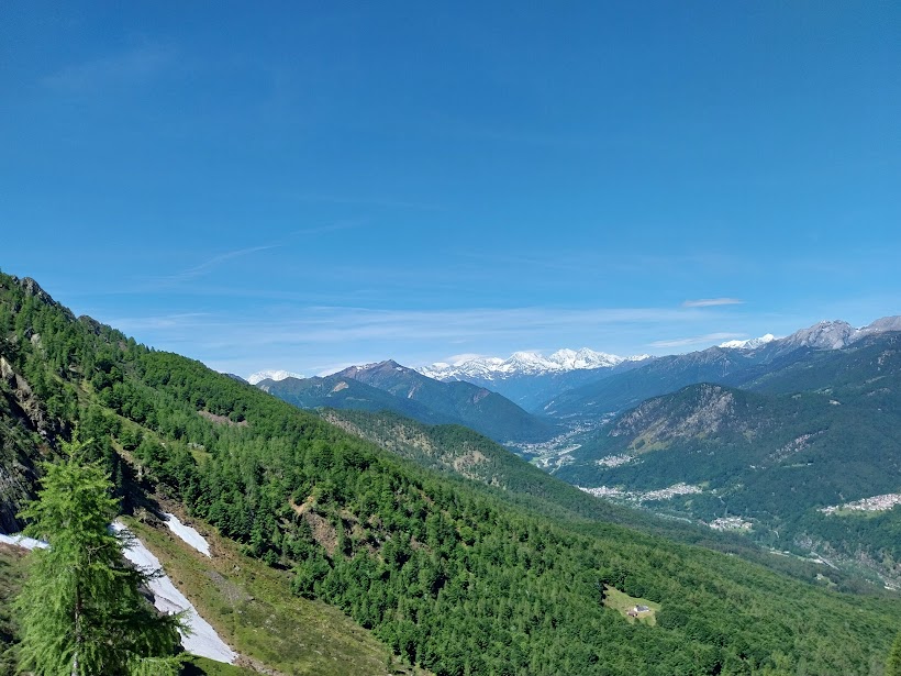 Ad occidente splendono i Quattromila. In tre quarti d’ora ridiscendiamo a L’Alpino per pranzare sui comodi tavoli. Con tutta calma, in un’ora e mezza, torniamo alle auto lungo il percorso di salita. Al bar di Malesco chiudiamo in bellezza la giornata.