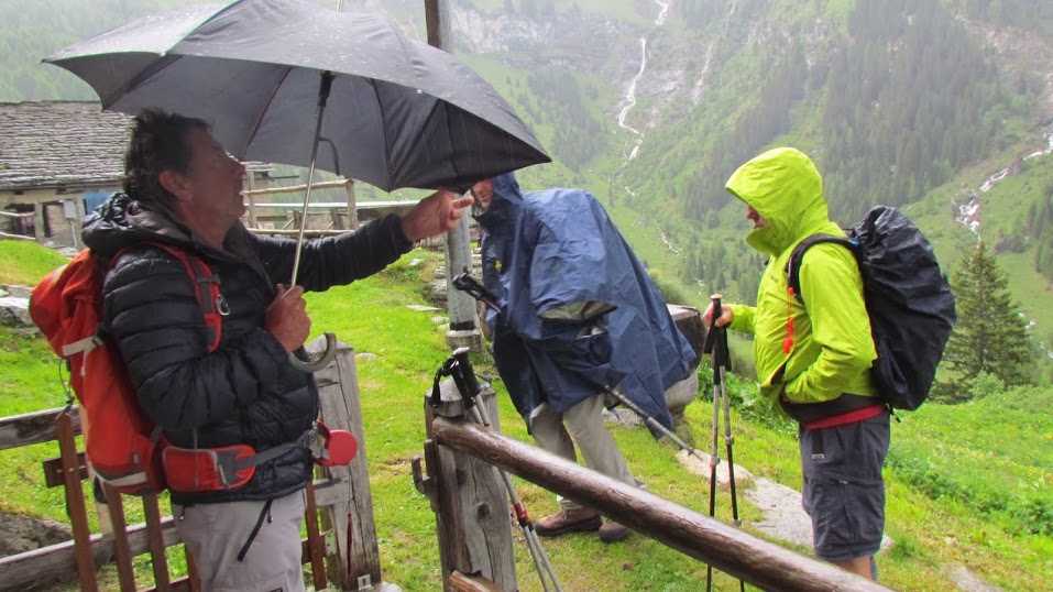 A fine pranzo siamo costretti a rifugiarci in baita per un improvviso quanto non previsto temporale, alla faccia delle previsioni ottimistiche. Il diluvio si protrae e lo sfidiamo, senza ombrelli e mantelle. In un'ora siamo alle auto, fradici e contenti.