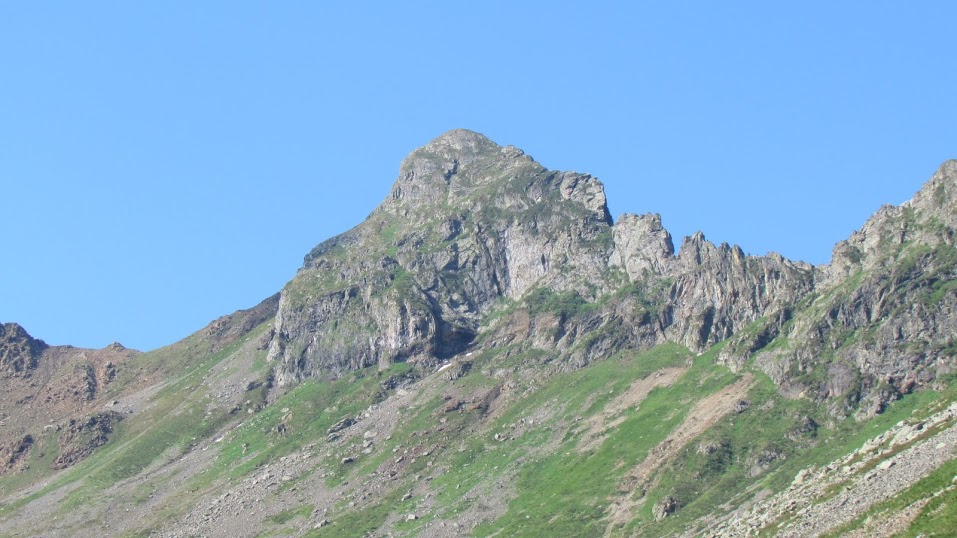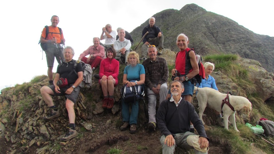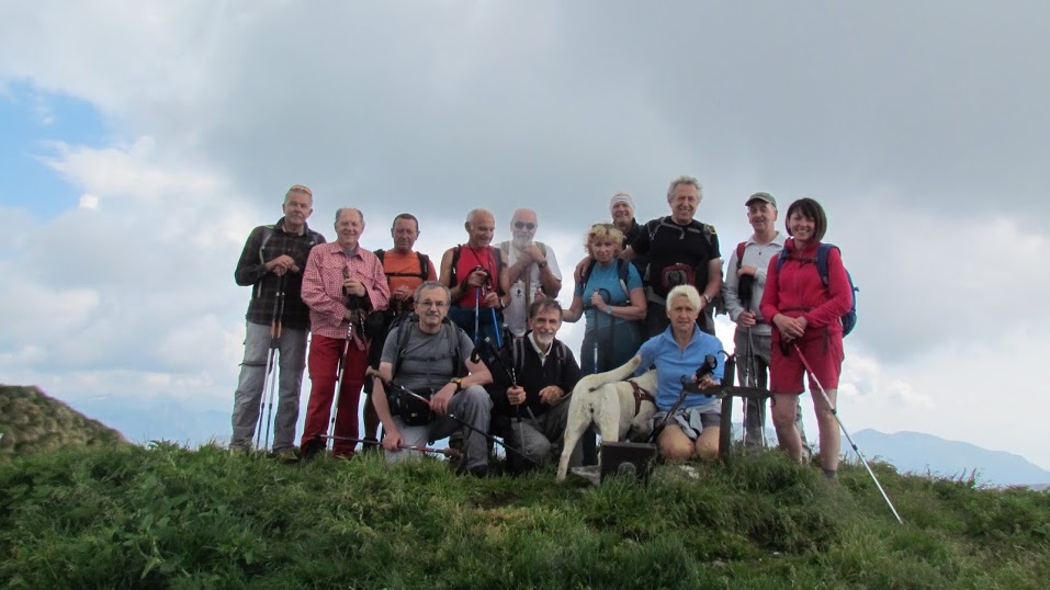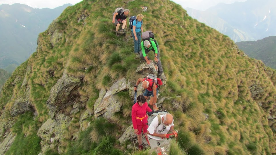 Un passaggio facile, ma leggermente esposto, porta dall'anticima alla cima. Qualcuno trova anche il tempo di posare con scarsa delicatezza la faccia sul prato, fortunatamente senza danni, nonostante le raccomandazioni delle autorità. Ridiscendiamo al passo e recuperiamo i materiali ivi parcheggiati. I primi nuvoloni si addensano, ma tanto non pioverà fino a tarda sera. Ci avviamo in discesa lungo il sentiero di salita per circa duecento metri e, ad un bivio, ne imbocchiamo uno verso sinistra (nord), prima in leggera discesa e poi in risalita per poche decine di metri fino al Passo del Crac, ufficialmente 1968, ma a me sembra un po' meno.