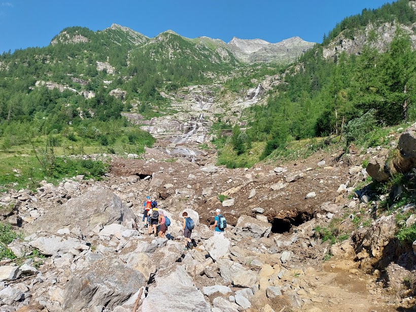 Con il mio cinquanta per cento di sangue macugnaghese che ribolle seguo gli amici nel tratto ancora pianeggiante fino all’Alpe La Piana, 1613. Da qui a quel che resta dell’Alpe Schena, 2005, il sentiero a tornanti ha pendenze ancora morbide, ma diventa più faticoso e sempre “infinito”, come tutta questa meravigliosa valle. Arriva anche il sole.