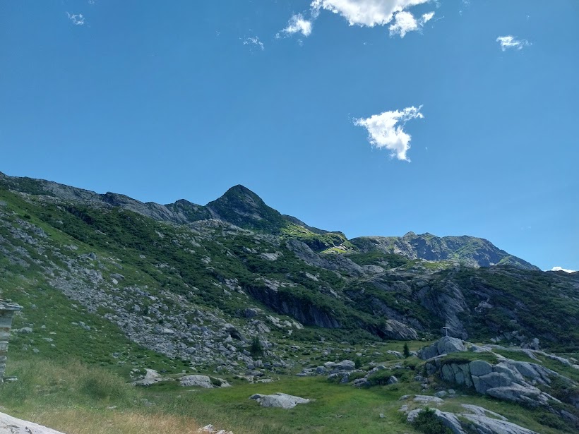 In dolcissima salita, diretti a sud, raggiungiamo l'Alpe Loana, 1327, e passiamo sulla sinistra orografica del torrente fantasma a Le Fornaci, 1350. La mulattiera M14 inizia a salire e io seguo a debita distanza il folto gruppetto che inserisce subito le marce alte considerandosi, per ora, in una tappa di “avvicinamento”. Lo zaino è pesante e fa pure caldo.