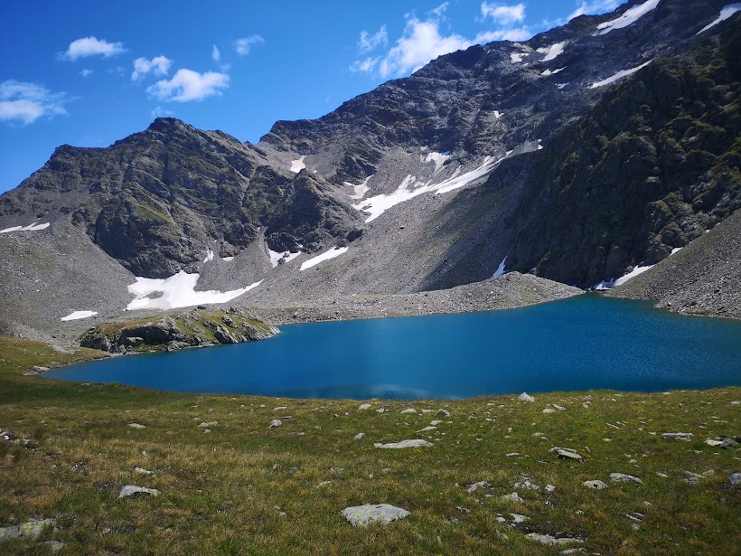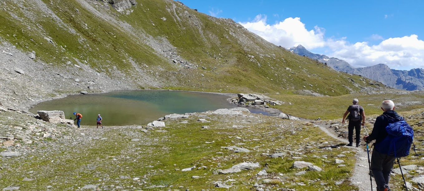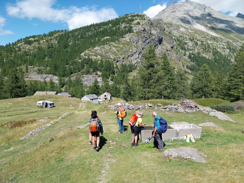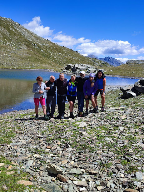 Dopo pochi minuti ci fermiamo in riva al laghetto più alto, 2580, per il pranzo. Soddisfatti di una laboriosa foto di gruppo, scendiamo al più grande dei laghi, 2431, lo costeggiamo e passiamo dai residui di quello più in basso, praticamente cancellato dal crollo di un tratto di morena, tanti anni fa, in modo simile a ciò che avvenne al Lago delle Locce nel 1979, a Macugnaga. La discesa sul sentiero evidente e da percorrere con attenzione nel tratto che costeggia la bella cascata ci porta a Chusmatte, 1810, ed alle auto ad Engiloch in due ore e mezza da Sirwoltesattel.