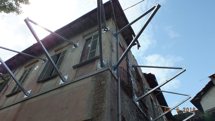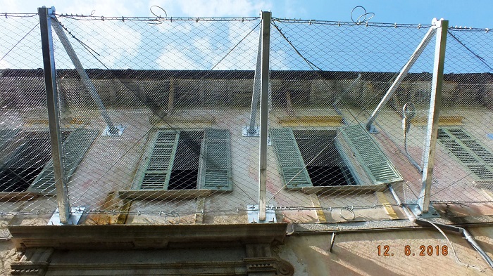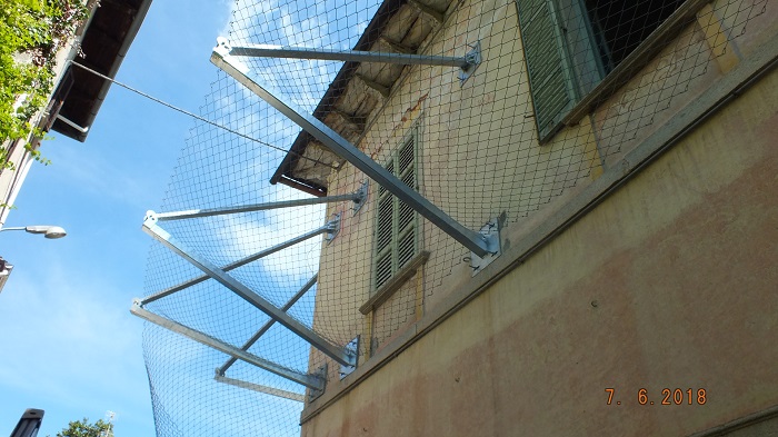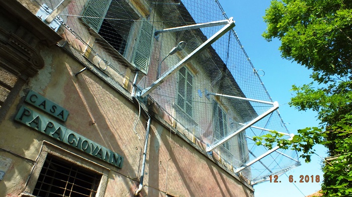 Così lo spiega l’ing. Gattone: “Sono state realizzate alcune strutture, in carpenteria metallica zincata, necessarie per l’istallazione di reti metalliche deformabili e funi metalliche in grado di assorbire e contenere la forza di impatto provocata da un eventuale crollo della copertura e dei rivestimenti in pietra delle finestre del primo piano della Casa Papa Giovanni. E’ stato necessario progettare un sistema di protezione non rigido e con un’elevata capacità di potersi deformare, in questo modo -prosegue Gattone- la forza di impatto, provocata dalla caduta della copertura sulle reti metalliche, sarà limitata e trasferibile alle strutture in carpenteria metallica e alle murature dell’edificio esistente. La posizione delle reti di protezione dovrà permettere di intercettare l’eventuale crollo della gronda di copertura del tetto della Casa Papa Giovanni e dei rivestimenti, dei davanzali e delle cornici in pietra delle finestre esistenti al primo piano. Per tali ragioni tale posizione è stata prevista al di sotto delle finestre del piano primo dell’edificio”.