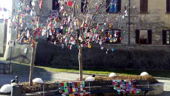 DIVIGNANO -10-12-2019 - La torre del castello di Divignano rivestita con una maxi coperta realizzata all'uncinetto: è stata inaugurata ufficialmente domenica, 8 dicembre. L'iniziativa "Natale all'uncinetto", ha visto la realizzazione di migliaia di quadrati di 13x13 centimetri che, sono stati poi assemblati in altri quadrati più grandi che alla fine hanno composto la grande coperta. Altri quadratini addobbano alcune piante, mentre delle piccole coperte sono state collocate sulle piantine della piazza. L'iniziativa è stata di IdeandoDivignano ed è partita alcuni mesi fa. I quadratini saranno poi messi all'asta per realizzare un fondo da destinare a progetti per i bambini ed i nonni della comunità divignanese.