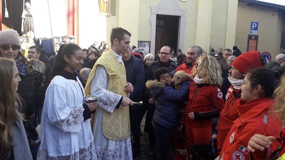 CASTELLETTO TICINO – 19-01-2020 - Anche due cavalli, una tartaruga e due gatti, insieme agli oltre 50 cani che hanno ricevuto dal vescovo di Ivrea Monsignor Edoardo Cerrato, la benedizione per la festa patronale di San Antonio Abate patrono degli animali. Ad attendere sulla piazza, dopo la messa solenne celebrata dal Vescovo eporediese con i religiosi di Castelletto Ticino, tantissimi animali, ma in gran parte cani. Come il gruppo della CRI guidato da Matteo Ramponi, che li utilizza per cani da ricerca in superficie. Spiega :” I cani del nostro centro di Glisente sono 14, in piazza abbiamo portato i nuovi arrivi Taiss, Maggie, Margot, Iumi, Dina e Shiba.” In piazza anche l’ex consigliere comunale Paolo Sibilia con il cane più grosso del gruppo un pastore caucasico di nome Wilson. Solo due i gatti. Due anche i cavalli del Maneggio di Castello. Nickory, 12 anni e Sally di 10, montati da Ceyenne Vidoli e Nicholas Bertoni. Durante la celebrazione in chiesa, davanti al sindaco Massimo Stilo e ai sindaci “gemellati” dei paesi che si chiamano Castelletto, è stato annunciato che domenica prossima si terra la “Messa dei Popoli” con il gruppo Telep Africa che pregherà con i canti tipici. Al termine della celebrazione verrà ritirata la statua del Santo apparsa in piazza durante la celebrazione di una tradizione che dura da anni e che in passato portava sul sagrato della chiesa anche mucca, pecore, maiali ed altri animali da fattoria.