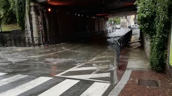 in un torrente, zona di Corso Europa già a rischio esondazione, passeggiata bassa allagata, torrente Vevera ingrossato. Il nubifragio abbattutosi oggi tra le 11 e le 15 ad Arona ha creato grossi disagi. Impressionante il fiume d’acqua che si è riversato in Corso Cavour dove i tombini non hanno retto alla forza dell’acqua. Parzialmente allagati alcuni negozi, che hanno riaperto nel pomeriggio, e alcune cantine. Il sindaco Alberto Gusmeroli, stante l’innalzamento del livello del lago di cinque centimetri all’ora, ha esortato gli abitanti di Corso Europa e del quartiere Riviera a sgombrare cantine e garage. Sul lungolago è andato “sottacqua” il Marconi Beach , uno dei bar della passeggiata bassa e anche la spiaggia delle Rocchette. Gonfio il torrente Vevera; in centro, fiume d’acqua all’incrocio sotto il ponte della ferrovia. Numerosi gli interventi dei vigili del fuoco. (M.R)