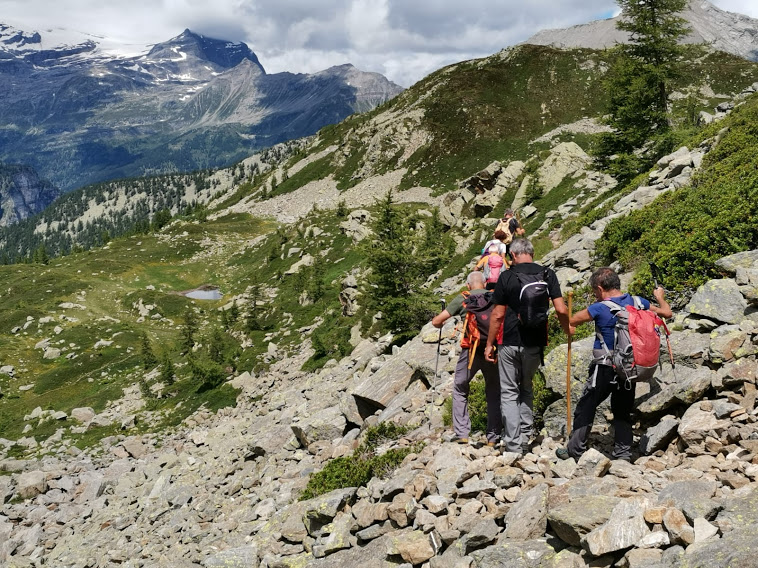 Attraversiamo il lungo ponte verso est ed imbocchiamo il sentiero che, tagliando a volte la strada, la riprende nell’ultimo tratto pianeggiante e ci porta all'Alpe Possette o Pussetta. Il sentiero è ben segnato e ben raccordato con la strada. Non saremo per caso in Svizzera? A sinistra si sale al Monscera. Noi teniamo la destra virando gradualmente a sud e saliamo all'Alpe Waira, 1854, ben dotata di pannelli solari e raggiunta anche dalla strada sterrata. Camminiamo da poco più di un’ora e un quarto. Siamo nella valle laterale di destra orografica che confina con la bella e indisciplinata Italia attraverso il Passo di Monscera. All’alpe parliamo di formaggio con i pastori e fotografiamo i maiali rossocrociati con le maglie della Juventus, rosa e bianconere.
